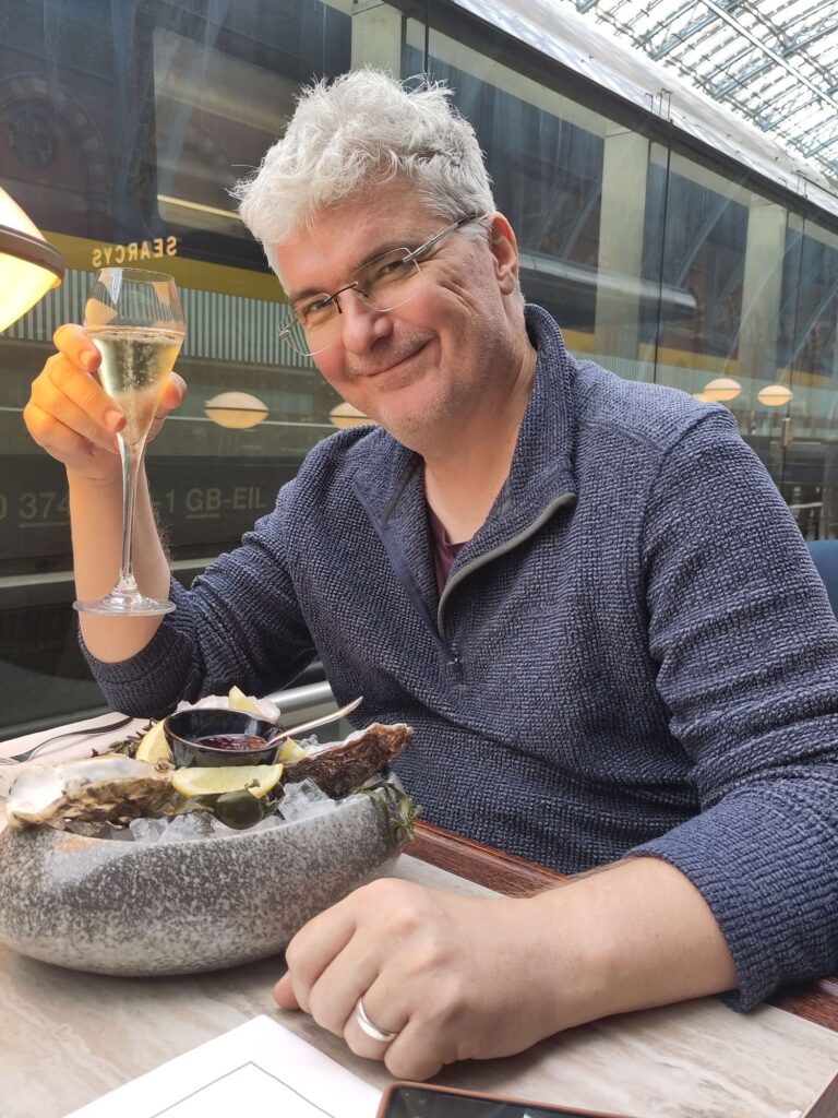2023 St. Pancras Trainstation. Ich bin 2023 mit meiner Mutter und mit meiner damaligen Freundin mit dem Zug nach London gefahren. Wien – Frankfurt – Brüssel und dann mit dem Eurostar nach London. Und dort fährt man Buchstäblich mit dem Zug (der im Hintergrund bzw links zu sehen ist) am Bahnsteig ein und direkt am Bahnsteig ist die Searcys Champagen Bar. Und ich hatte schon öfter davon geträumt da mit dem Zug einzufahren und mich gleich in die Bar zu setzen. Gesagt, getan.
